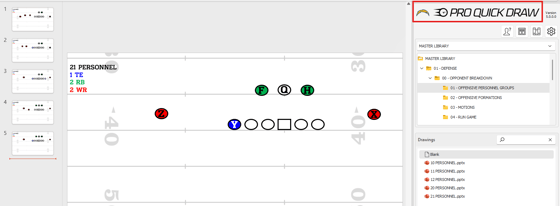 - Insert an existing play drawing from your play library directly onto a slide as an editable drawing—outside of the template structure—so you can modify as needed.