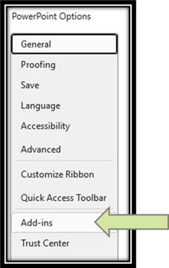 Open PowerPoint and go to Options and then Add Ins