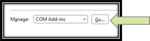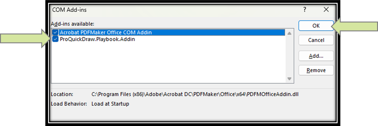 Select Go next to Com Add Ins and then make sure the check box for ProQuickdraw.Playbook.Addin is checked off and hit Okay