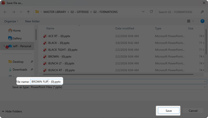 Once you click that newly copied and renamed play will open in a new PowerPoint window for you to make your edits, save that new file and exit the new window. You will then see that new play in your playbook window