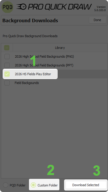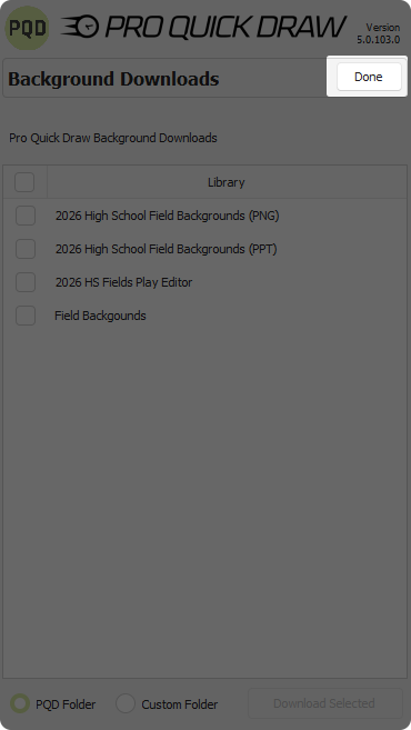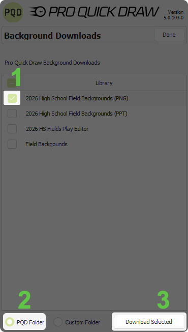 First you want to choose the field backgrounds labeled (PNG), then make sure PQD Folder is selected and click the Download Selected button