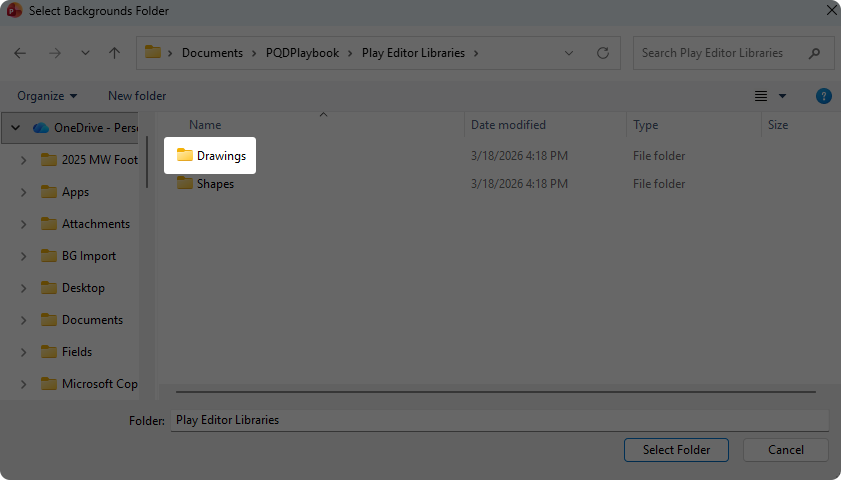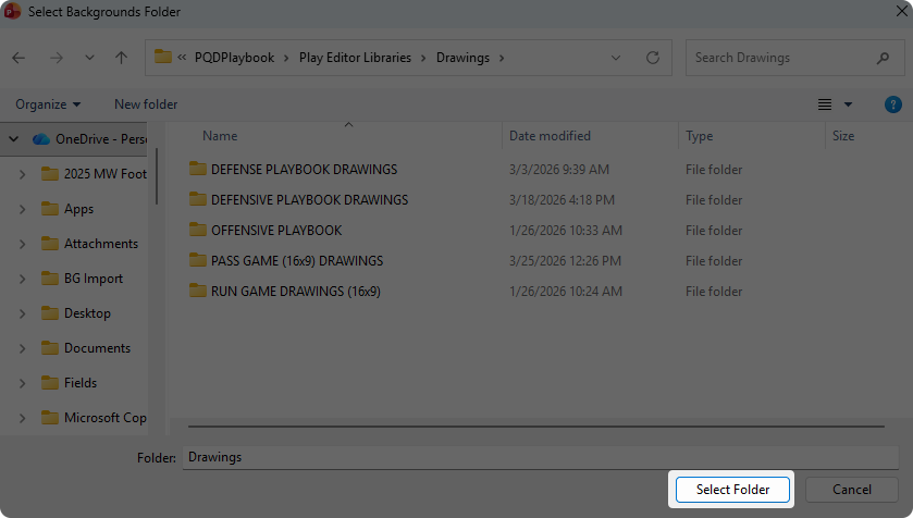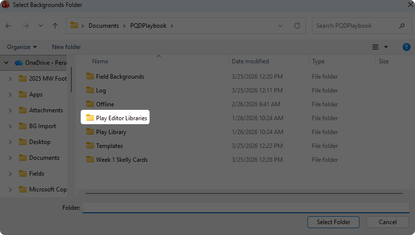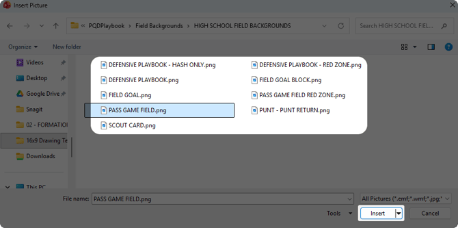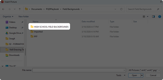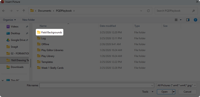 Once File Explorer opens, navigate to your PQDPlaybook folder where you installed the field backgrounds images (By default this is Documents > PQDPlaybook unless you chose to install the images elsewhere) and double-click Field Backgrounds