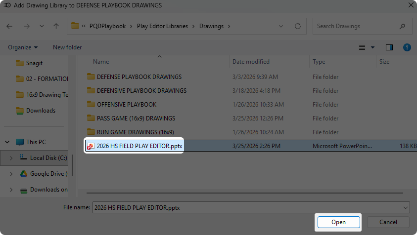 Navigate to the Drawings folder where we installed the Play Editor field background file, select the .pptx backgrounds file and click Open