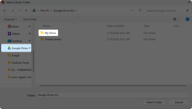 - Once the Select Library Folder window opens, navigate and select Google Drive in the navigation pane on the left, then double click on My Drive.