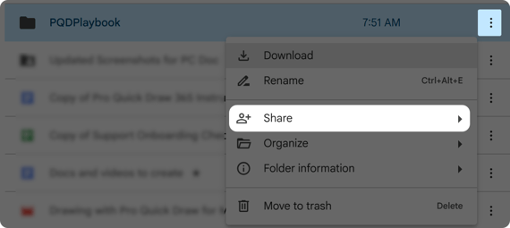 - Select the 3 dots to the right of the PQDPlaybook folder and hit Share to add the emails of the coaches that you want to have have access to these files. Press Send.